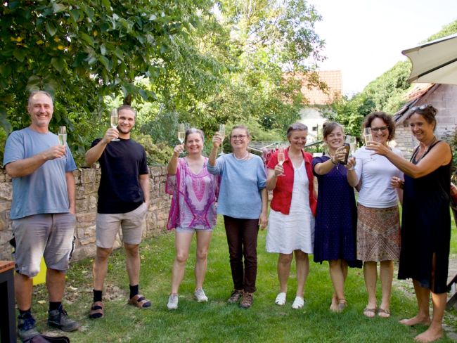 Nach langer Vorarbeit ist unsere Satzung endlich fertig. Ein Grund zum Anstoßen für Armin, Hendrik, Sabine, Kornelia, Sabine, Lisa, Moni und Judith.